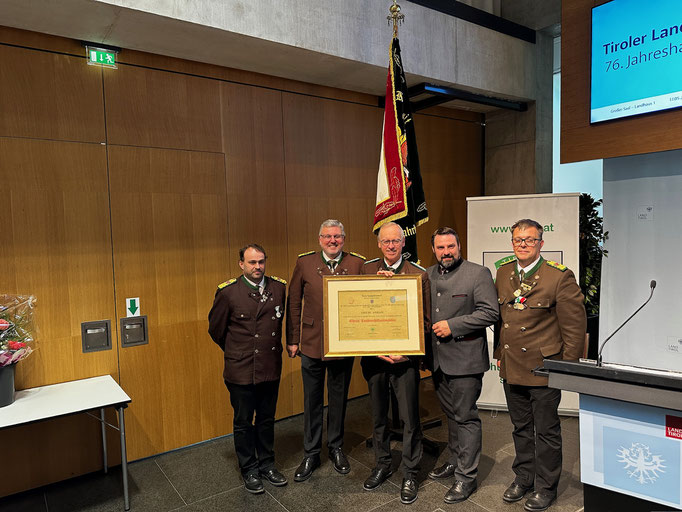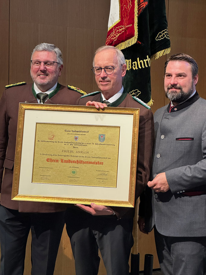 Bei der 76. Jahreshauptversammlung des TLSB am 17. Mai im Landhaus in Innsbruck wurde unser Ehren-Oberschützenmeister Friedl Anrain für seine langjährige Tätigkeit im Landesschützenbund einstimmig zum Ehren-Landesschützenmeister ernannt. Diese Ehrung ist höchst verdient, wenn man auf seine Leistungen für das Schützenwesen zurückblickt.